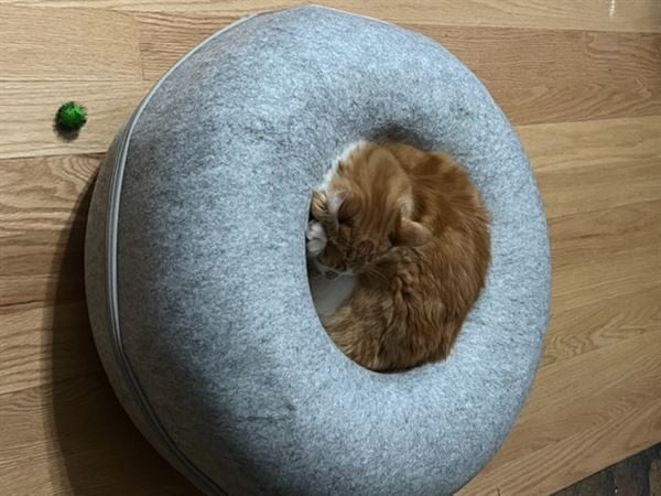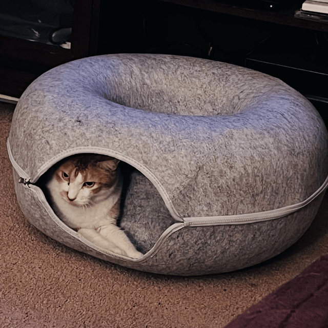 It's made from compressed, pliable fabric which is hard-molded into a donut-shaped, super cozy dwelling for cats to huddle under and snuggle in for a quiet, restful sleep or play fight with their feline friends.
